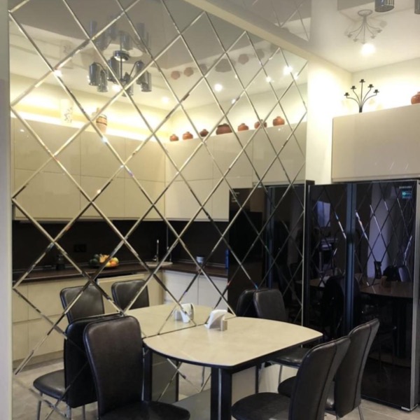 Использовалась серебристая зеркальная плитка формы "вытянутый ромб".